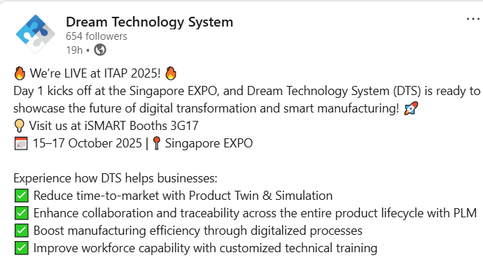 Dream Technology System (DTS) 由一群來自各行各業(yè)、相信通過提高效率、生產(chǎn)力和增值來幫助客戶實(shí)現(xiàn)卓越成就的年輕企業(yè)家創(chuàng)立的組織。在新加坡和馬來西亞運(yùn)營(yíng),擁有4個(gè)辦公室以支持我們的客戶,已與西門子數(shù)字工業(yè)軟件(SISW)、ZWSOFT、Shining 3D 和 Zortrax 建立了戰(zhàn)略合作關(guān)系,并在該地區(qū)獲得了西門子 SMART 合作伙伴認(rèn)證。DTS是一站式咨詢、服務(wù)和產(chǎn)品生命周期管理(PLM)解決方案提供商,幫助您解決業(yè)務(wù)痛點(diǎn)。